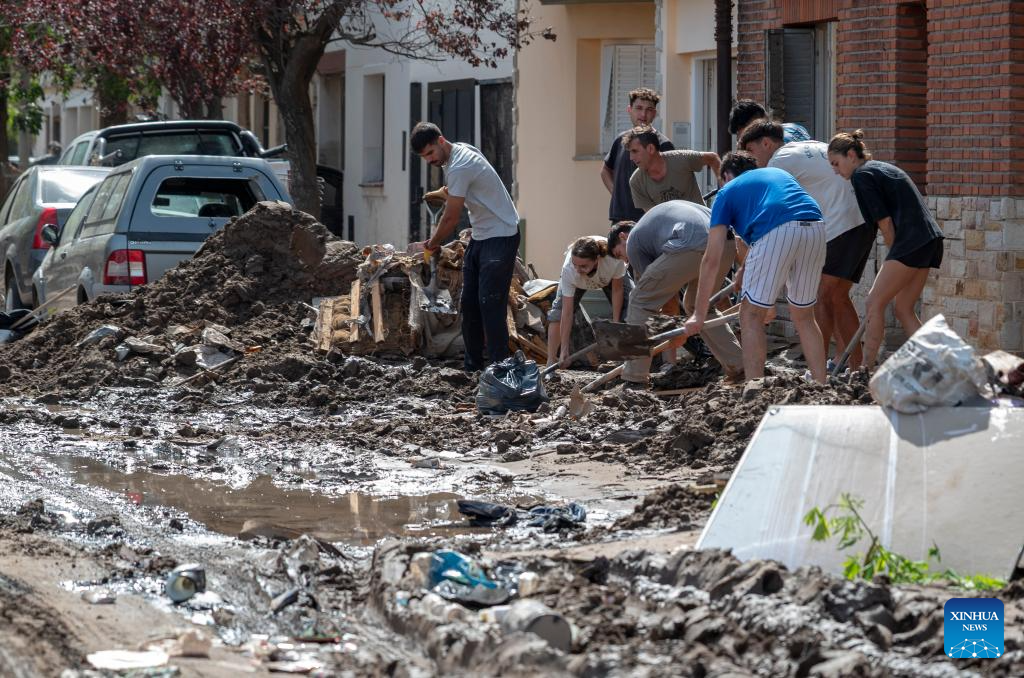 People clear up mud on a street in Bahia Blanca, Argentina, March 10, 2025. The death toll from the intense storm that struck the southern Argentine port city of Bahia Blanca has risen to 16. (Photo by Martín Zabala/Xinhua)