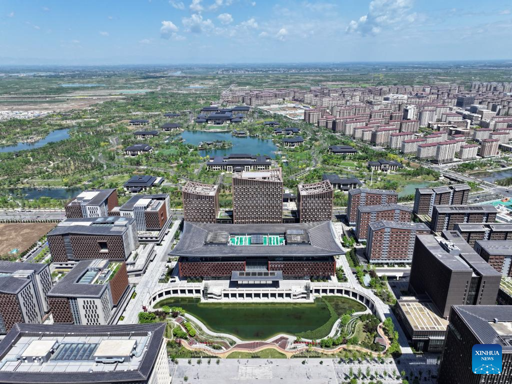 An aerial drone photo taken on April 23, 2024 shows the business service center in Xiong'an New Area, north China's Hebei Province. (Xinhua/Mu Yu)