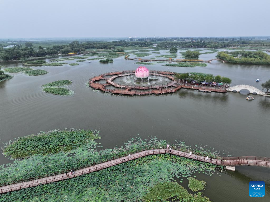 An aerial drone photo taken on July 9, 2024 shows people visiting a lotus-themed park at Baiyangdian Lake in Xiong'an New Area, north China's Hebei Province. (Xinhua/Mu Yu)