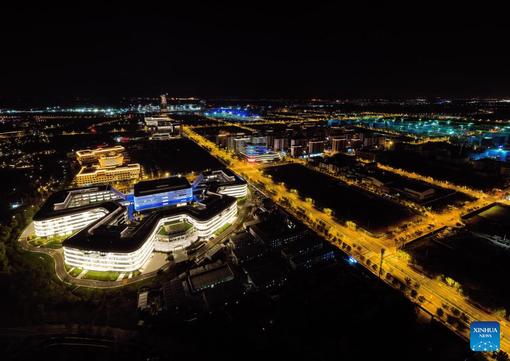 An aerial drone photo taken on Sept. 30, 2024 shows a night view of the start-up zone of Xiong'an New Area, north China's Hebei Province. (Xinhua/Mu Yu)