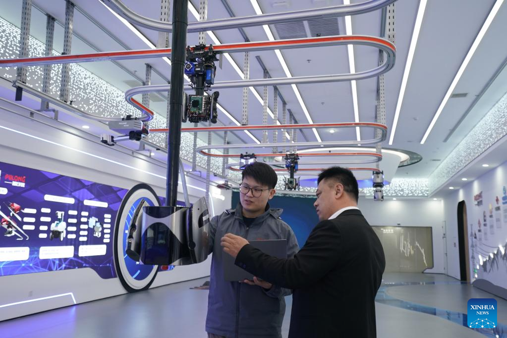 Staff members adjust a robot at a test base in the Xiong'an Science and Technology Innovation Center in Xiong'an New Area, north China's Hebei Province, Feb. 26, 2025. (Xinhua/Mu Yu)