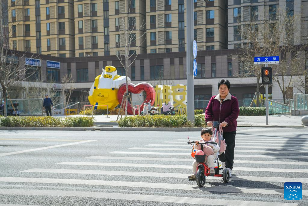 Residents walk across a street in Rongdong area of Xiong'an New Area, north China's Hebei Province, March 12, 2025. (Xinhua/Mu Yu)