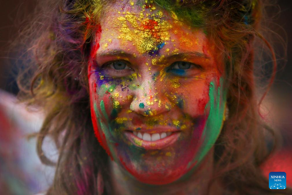(250313) -- KATHMANDU, March 13, 2025 (Xinhua) -- A woman smeared with colored powder celebrates the Holi Festival in Kathmandu, Nepal, March 13, 2025. Holi, the festival of colors, marks the end of winter and the onset of the spring season. (Photo by Sulav Shrestha/Xinhua)