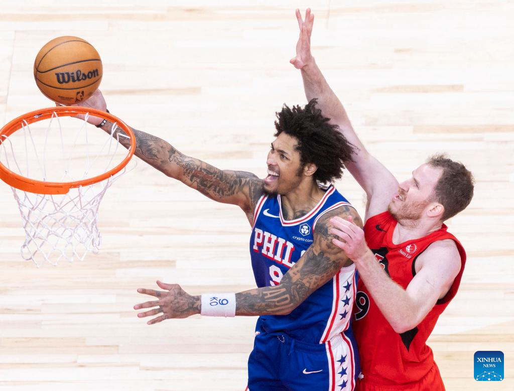 Kelly Oubre Jr. (L) of Philadelphia 76ers goes up for a layup during the 2024-2025 NBA regular season game between Toronto Raptors and Philadelphia 76ers in Toronto, Canada, on March 12, 2025. (Photo by Zou Zheng/Xinhua)