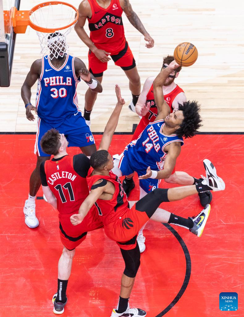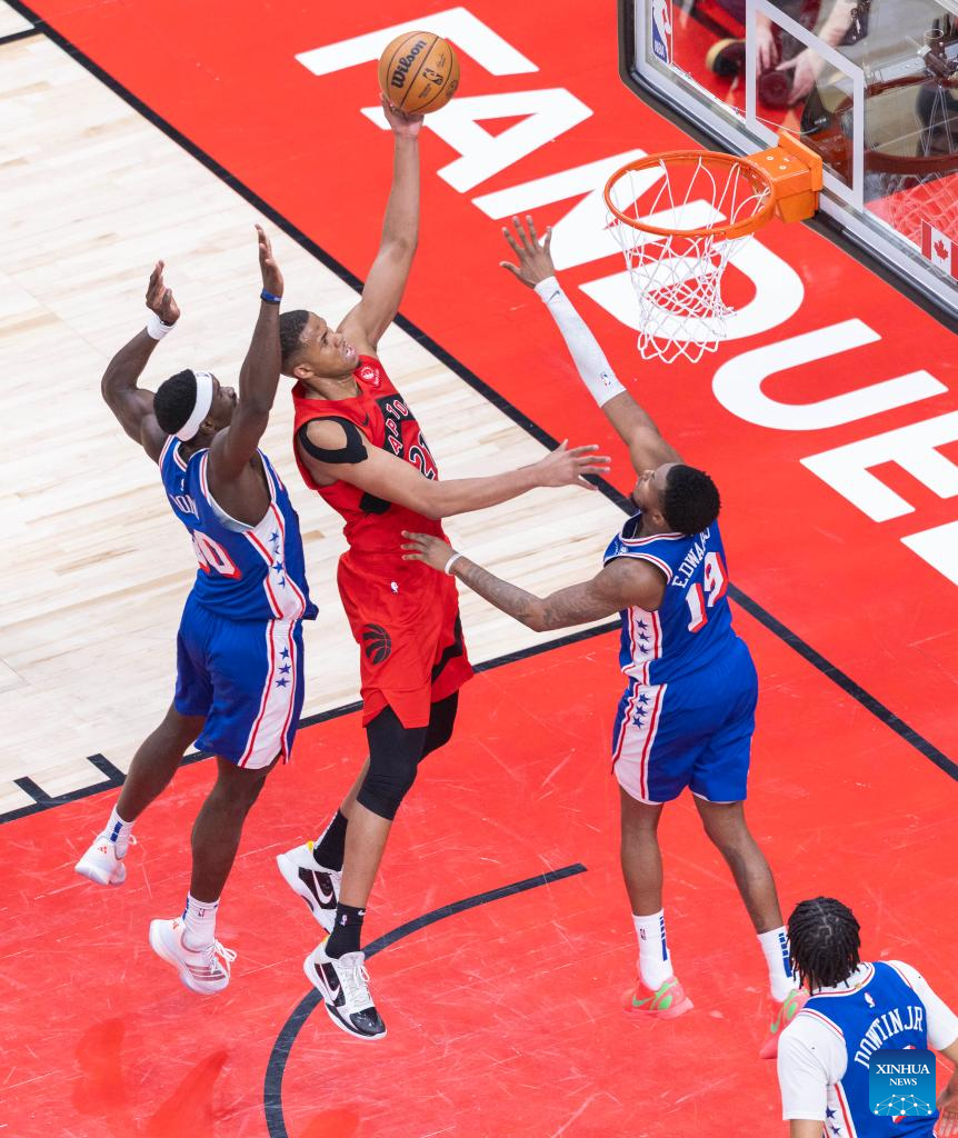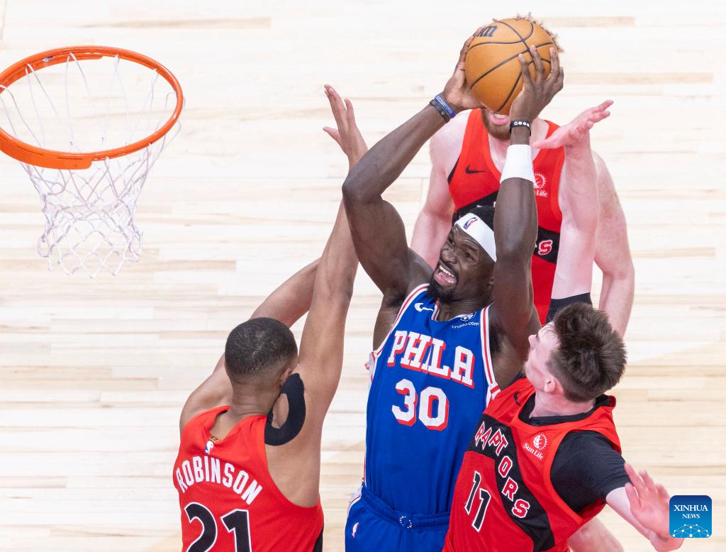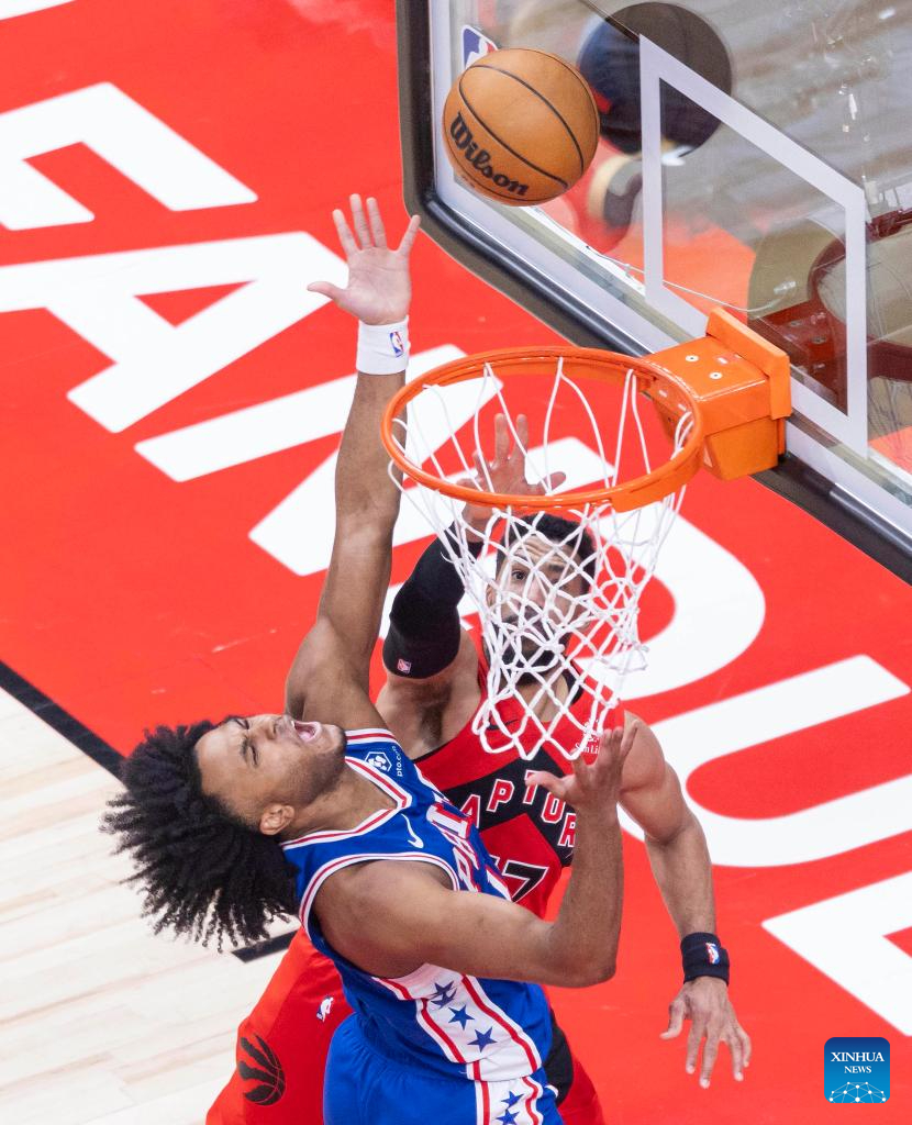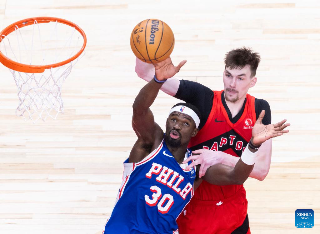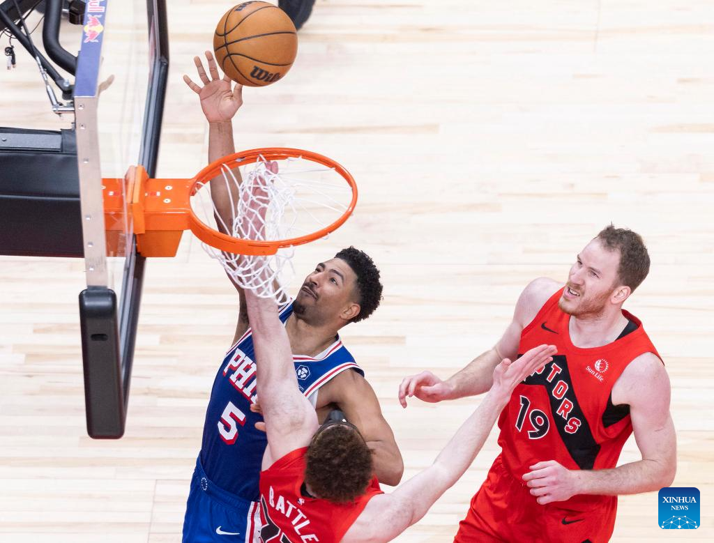 Adem Bona (C) of Philadelphia 76ers goes for a layup during the 2024-2025 NBA regular season game between Toronto Raptors and Philadelphia 76ers in Toronto, Canada, on March 12, 2025. (Photo by Zou Zheng/Xinhua)