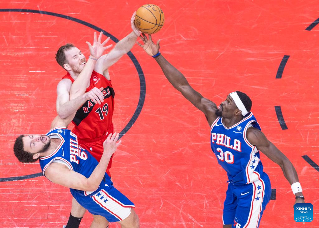 Jakob Poeltl (C) of Toronto Raptors fights for a rebound with Adem Bona (R) and Alex Reese of Philadelphia 76ers during the 2024-2025 NBA regular season game between Toronto Raptors and Philadelphia 76ers in Toronto, Canada, on March 12, 2025. (Photo by Zou Zheng/Xinhua)
