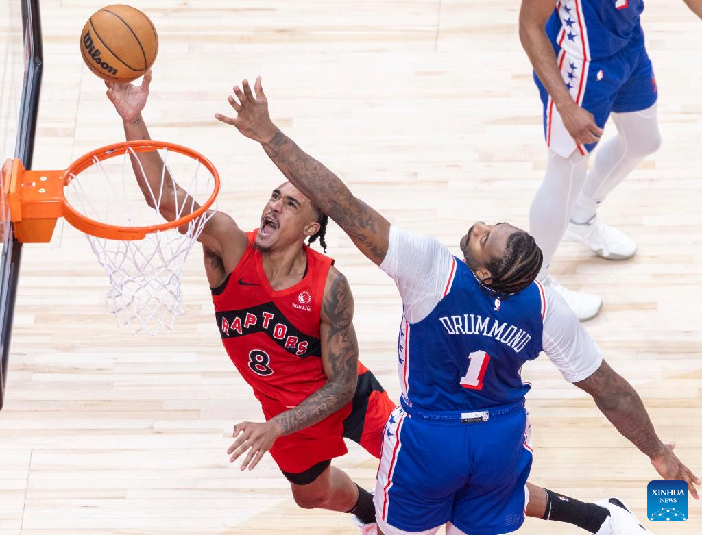 Jared Rhoden (L) of Toronto Raptors goes up for a layup during the 2024-2025 NBA regular season game between Toronto Raptors and Philadelphia 76ers in Toronto, Canada, on March 12, 2025. (Photo by Zou Zheng/Xinhua)