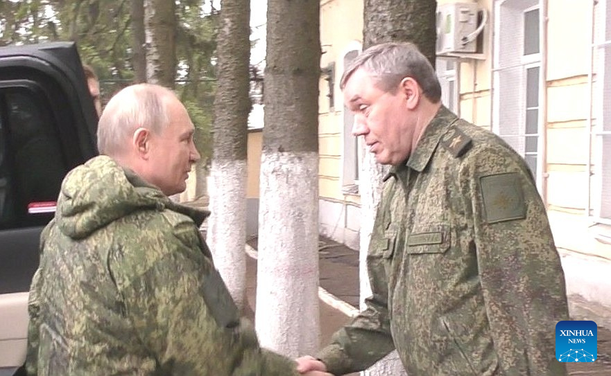 This photo posted on the Kremlin website on March 12, 2025 shows Russian President Vladimir Putin (L) and Chief of the General Staff of the Russian Armed Forces Valery Gerasimov shaking hands at a military command center in the Kursk region. Russian President Vladimir Putin on Wednesday proposed establishing a security zone along Russia's state border and demanded the complete expulsion of enemy forces from the Kursk region during a visit to a military command center overseeing operations in the area. (Kremlin Press Office/Handout via Xinhua)