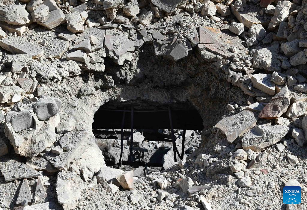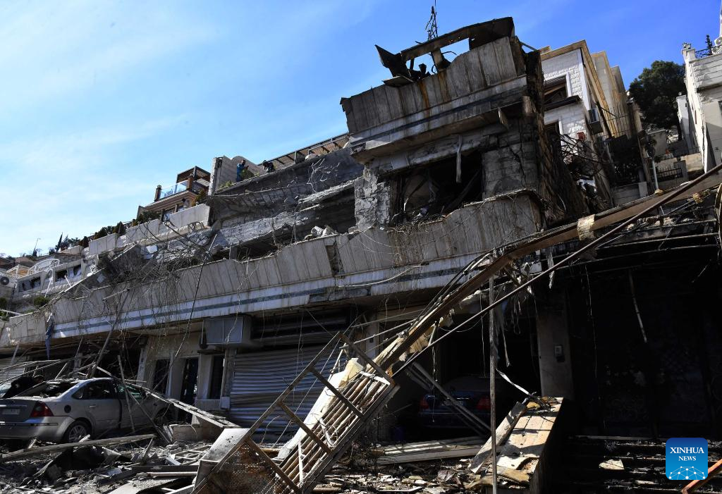 This photo shows the site of an Israeli airstrike in Damascus, Syria, March 13, 2025. An Israeli airstrike on Thursday targeted a residential building in the Mashrou' Dummar neighborhood northwest of the Syrian capital Damascus, killing one person, local media and a war monitoring group reported.