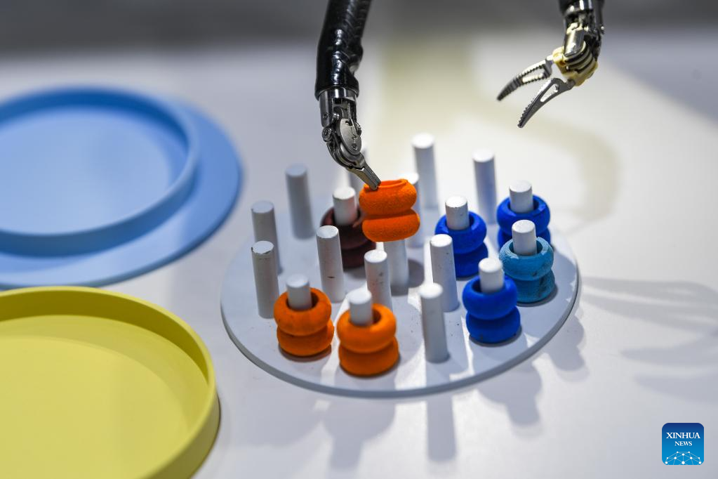 This photo taken on March 14, 2025 shows a surgical robot demonstration during the 2025 China Medical Equipment Conference & Medical Equipment Exhibition held at Chongqing International Expo Center in southwest China's Chongqing Municipality. The four-day exhibition kicked off here on Thursday with a total of 34 professional exhibition areas, including medical imaging, radiotherapy, medical examination, surgical equipment, hospital Internet of Things construction, artificial intelligence and medical robots, etc., showcasing over 10,000 new products, new technologies, new applications and new methods in the field of medical equipment. (Xinhua/Wang Quanchao)