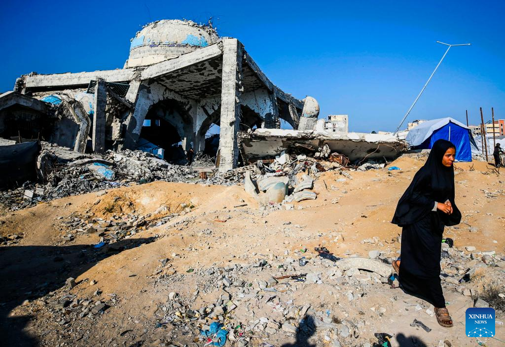 A Palestinian is seen in front of a destroyed building in Beit Lahia, northern Gaza Strip, on March 13, 2025. (Photo by Mahmoud Zaki/Xinhua)