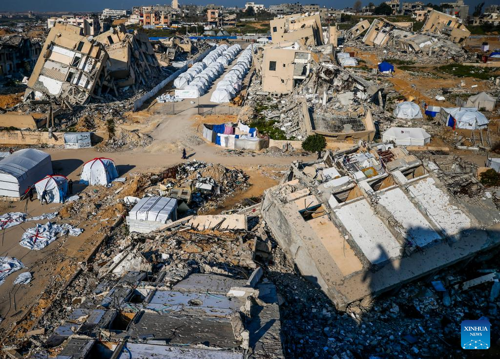 This photo taken on March 13, 2025 shows tents among destroyed buildings in Beit Lahia, northern Gaza Strip. (Photo by Mahmoud Zaki/Xinhua)