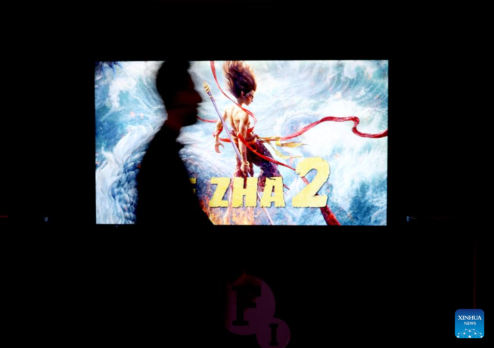 A man walks past a screen showing a poster of the Chinese animated film Ne Zha 2 before a preview screening at the BFI IMAX theater in London, Britain, on March 14, 2025. The Chinese animated blockbuster Ne Zha 2 made its much-anticipated European debut on Friday, with audiences in the United Kingdom (UK) and Ireland attending the first preview screenings ahead of the film's wide release. (Xinhua/Li Ying)