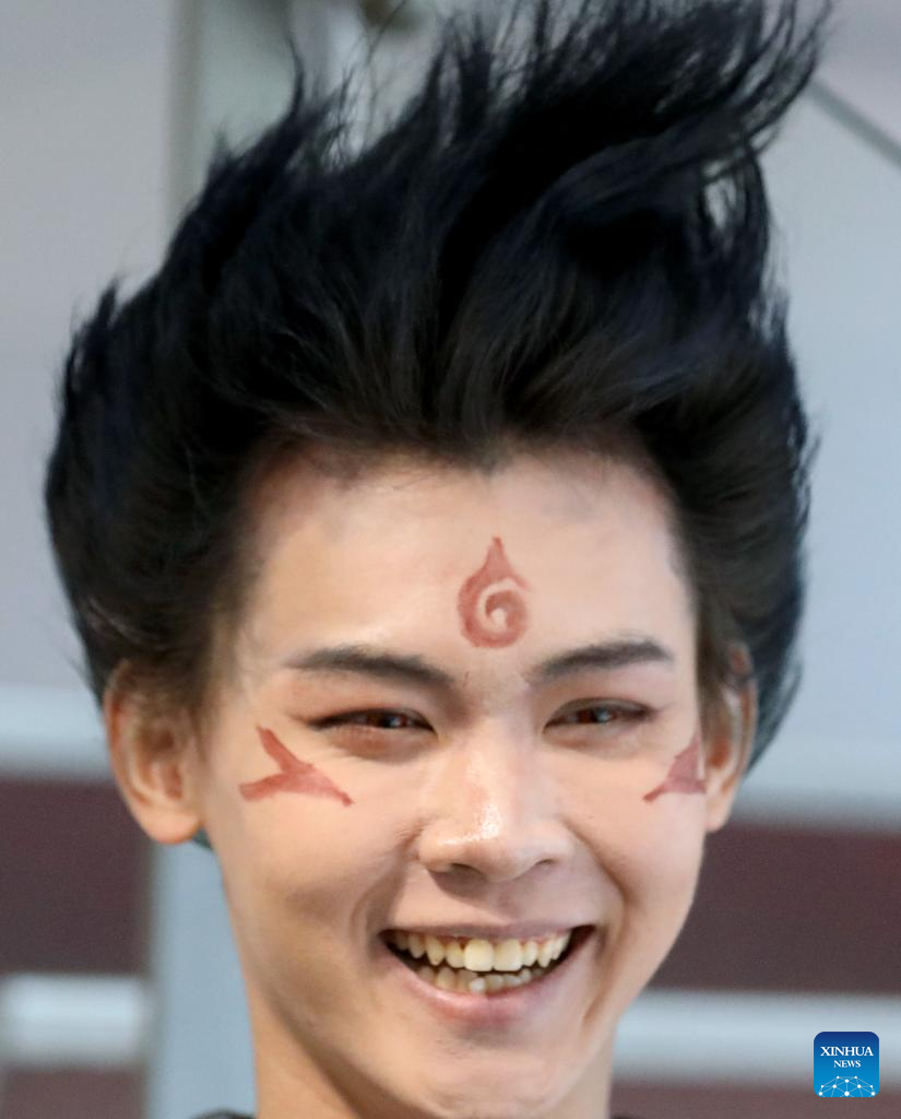 A fan dressed up as a character in the Chinese animated film Ne Zha 2 is seen after a preview screening at the BFI IMAX theater in London, Britain, on March 14, 2025. The Chinese animated blockbuster Ne Zha 2 made its much-anticipated European debut on Friday, with audiences in the United Kingdom (UK) and Ireland attending the first preview screenings ahead of the film's wide release. (Xinhua/Li Ying)