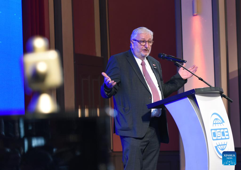 Christoph Matznetter, vice president of the Austrian Economic Chambers, delivers a speech during the third China International Supply Chain Expo Roadshow in Vienna, Austria, March 13, 2025. A roadshow of the third China International Supply Chain Expo was held here on Thursday, with bilateral cooperation highlighted and cooperation agreements signed. More than 200 representatives from trade and investment promotion institutions, business associations and enterprises of China and Austria participated in the event. (Xinhua/He Canling)