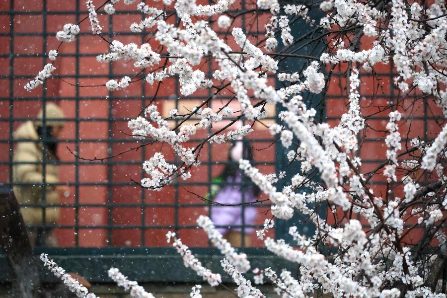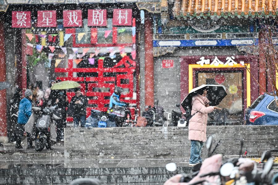 BEIJING, March 15 (Xinhua) -- Beijing experienced a sharp temperature drop on Saturday with multiple areas seeing snowfall. In response, municipal authorities decided to extend the heating season by two days, pushing it until Monday.