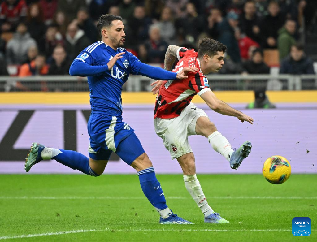 AC Milan's Christian Pulisic (R) scores during a Serie A football match between AC Milan and Como in Milan, Italy, March 15, 2025. (Photo by Alberto Lingria/Xinhua)