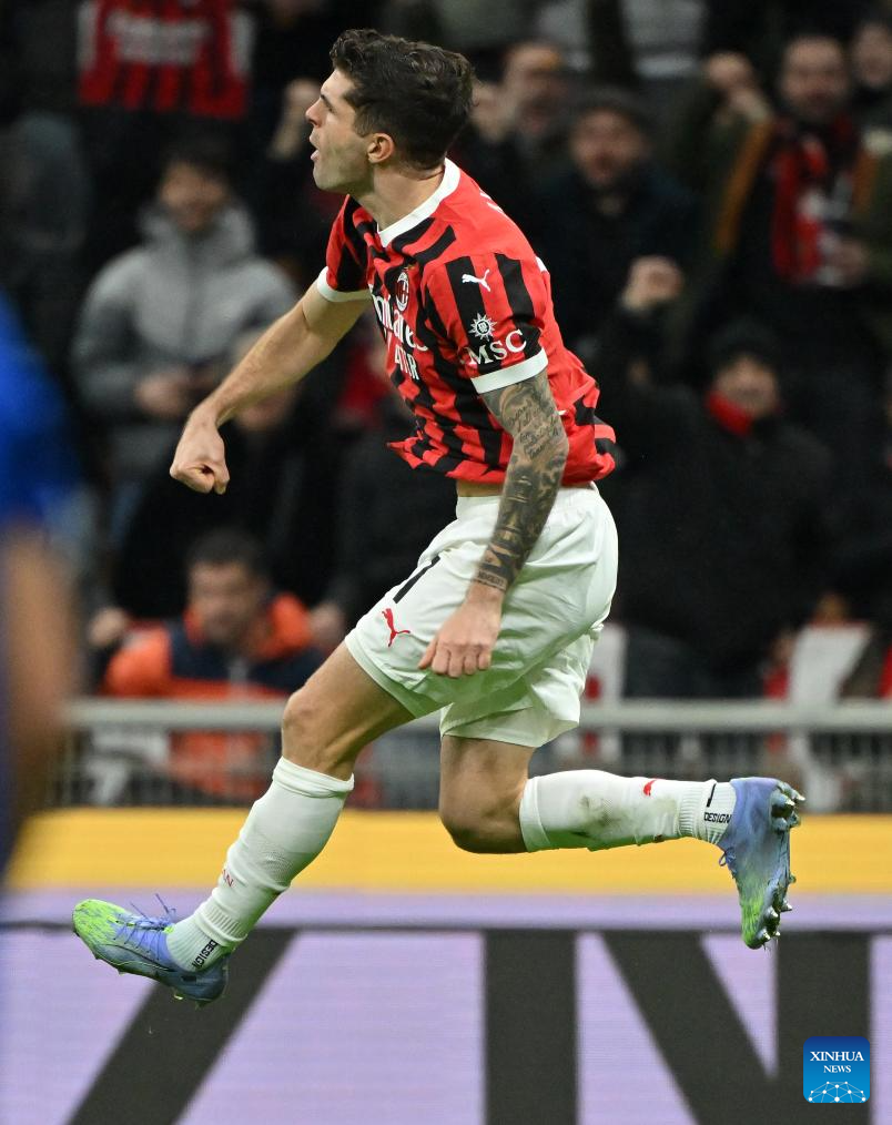 AC Milan's Christian Pulisic celebrates his goal during a Serie A football match between AC Milan and Como in Milan, Italy, March 15, 2025. (Photo by Alberto Lingria/Xinhua)