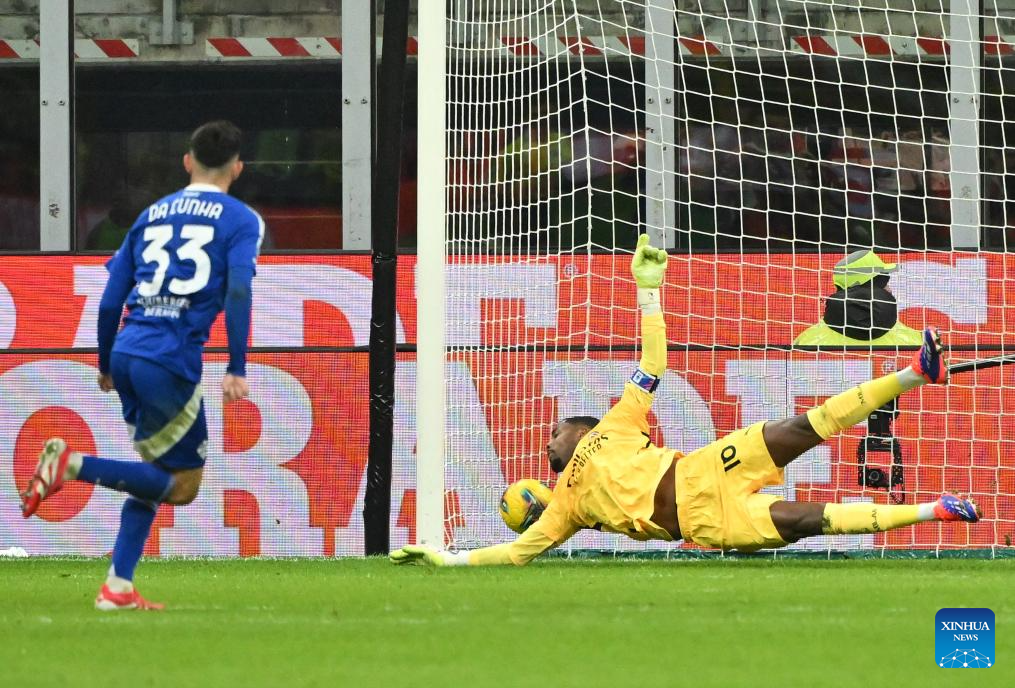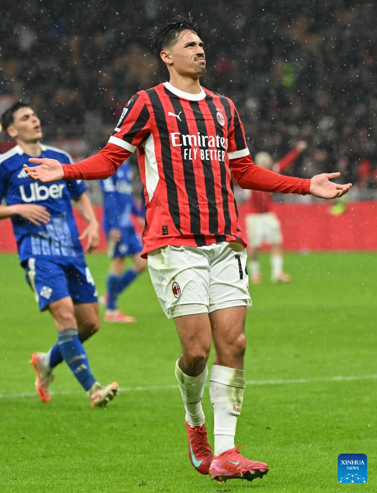 Como's Lucas Da Cunha (L) scores during a Serie A football match between AC Milan and Como in Milan, Italy, March 15, 2025. (Photo by Alberto Lingria/Xinhua)