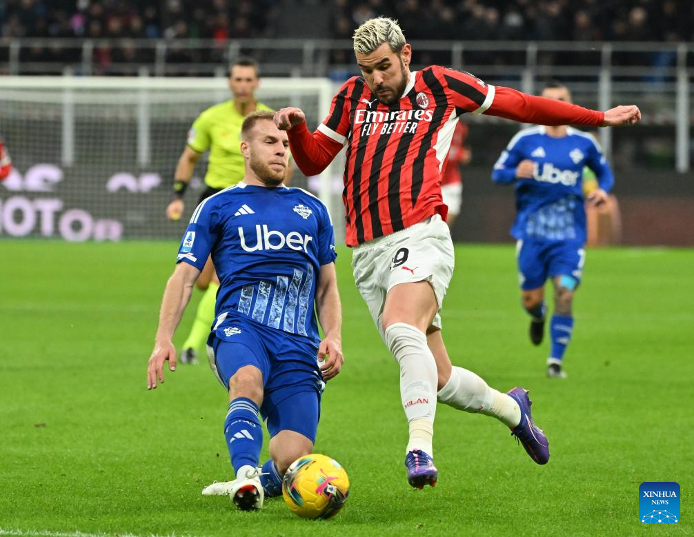 AC Milan's Theo Hernandez (R) vies with Como's Ivan Smolcic during a Serie A football match between AC Milan and Como in Milan, Italy, March 15, 2025. (Photo by Alberto Lingria/Xinhua)