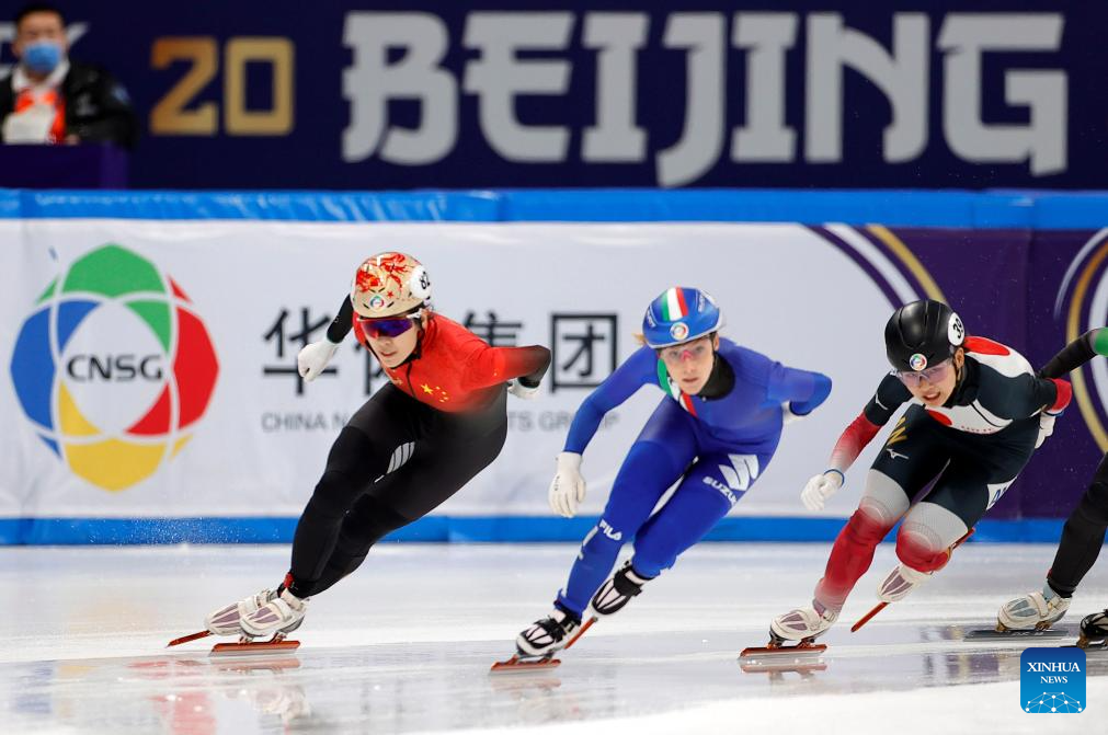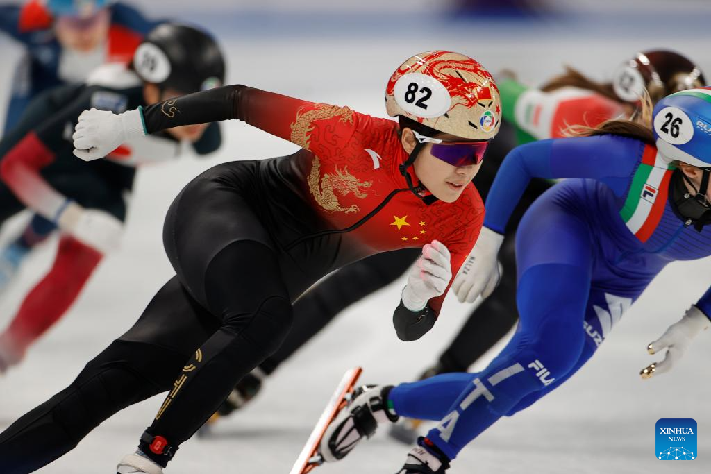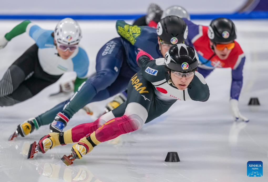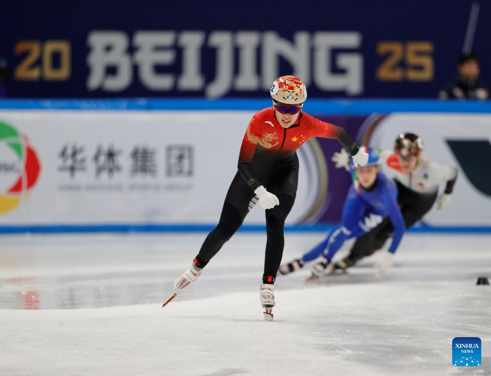Zhang Chutong of China (C) competes during the women's 1500m final B at the ISU World Short Track Speed Skating Championships 2025 in Beijing, China, March 16, 2025. (Xinhua/Ding Xu)