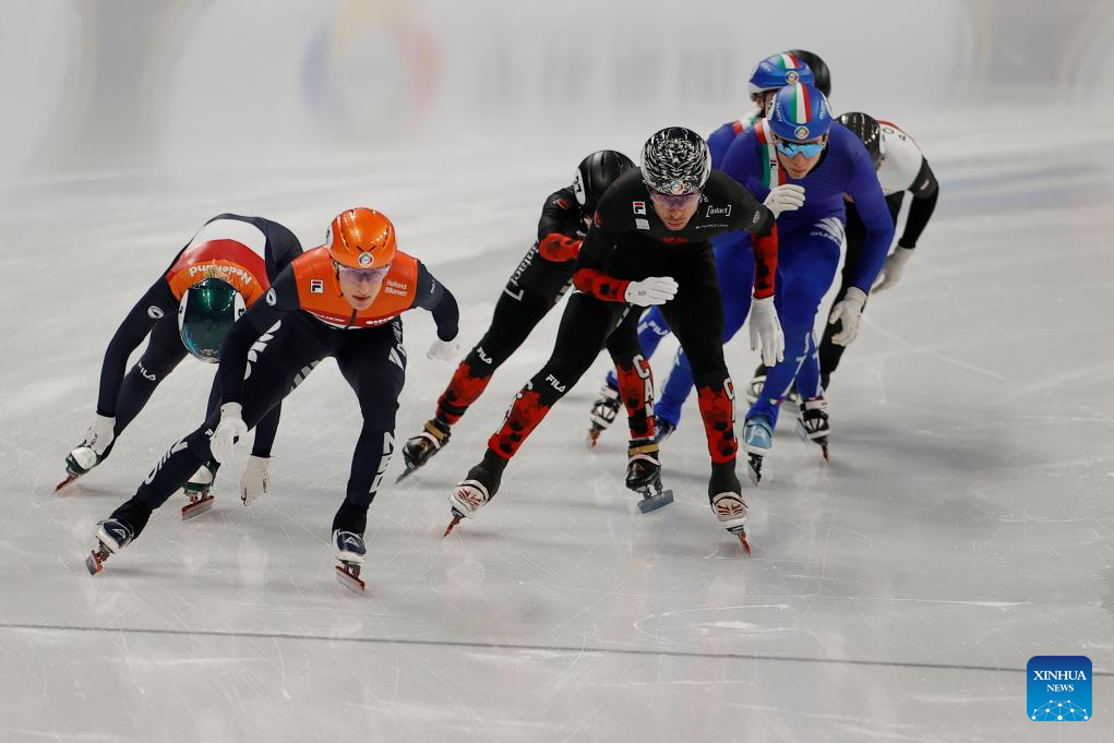 Hayashi Kosei (front) of Japan competes during the men's 1000m rep. semifinal at the ISU World Short Track Speed Skating Championships 2025 in Beijing, China, March 16, 2025. (Xinhua/Sun Fei)