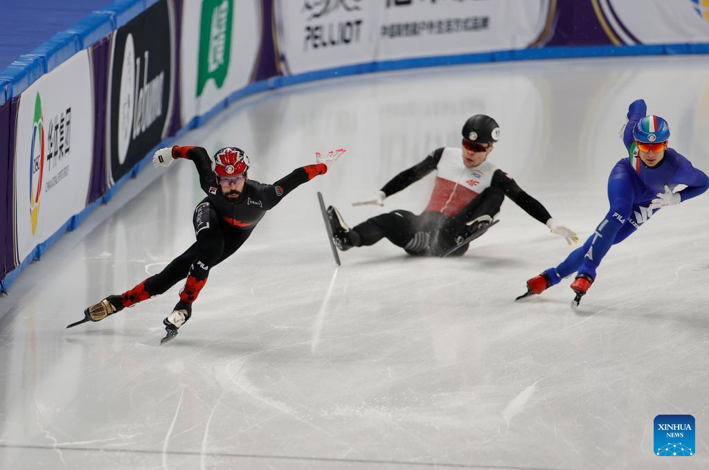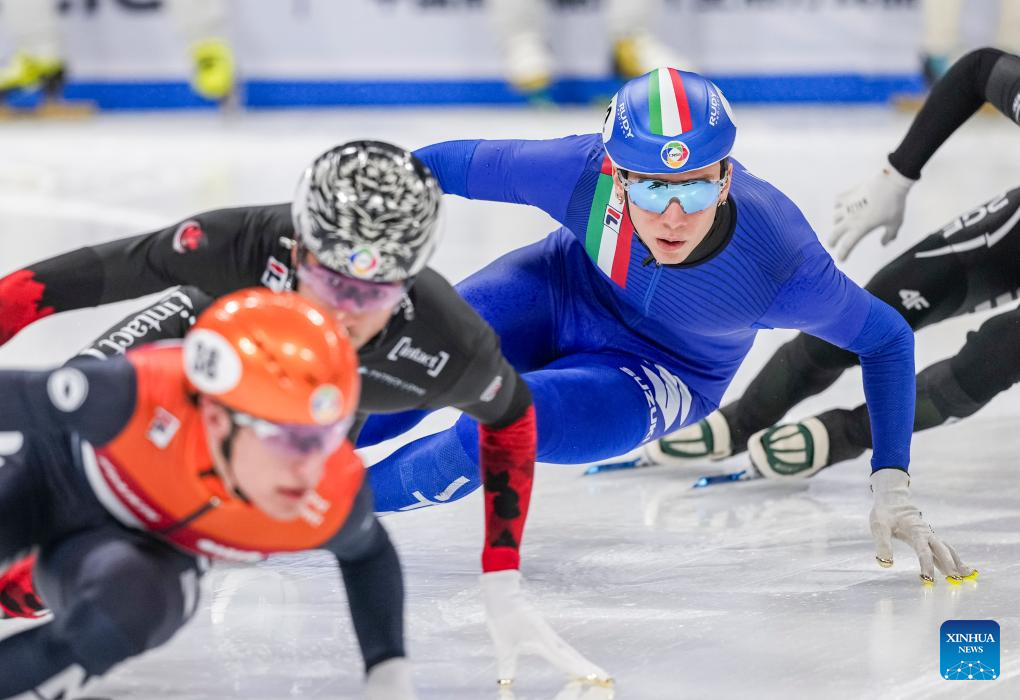 Thomas Nadalini (R) of Italy competes during the Mixed Team Relay final A at the ISU World Short Track Speed Skating Championships 2025 in Beijing, China, March 16, 2025. (Xinhua/Sun Fei)