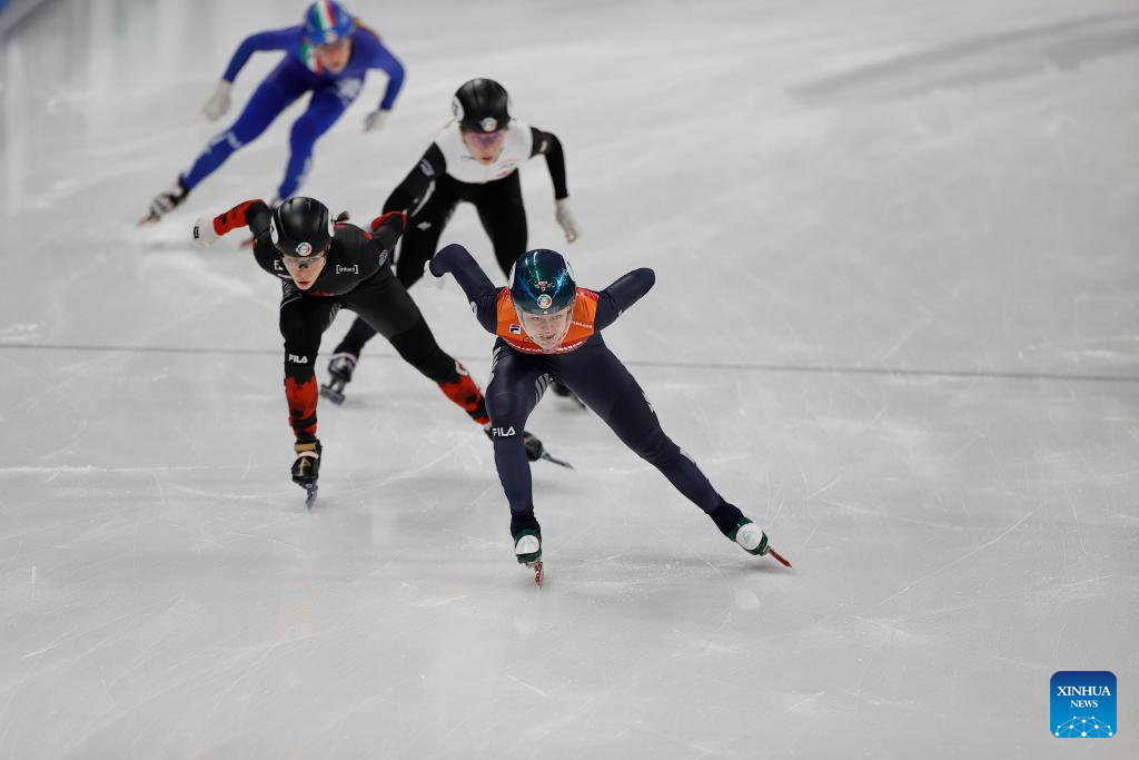 Xandra Velzeboer (Front) of the Netherlands competes during the Mixed Team Relay final A at the ISU World Short Track Speed Skating Championships 2025 in Beijing, China, March 16, 2025. (Xinhua/Ding Xu)