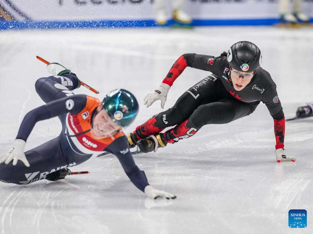 Xandra Velzeboer (L) of the Netherlands falls down during the Mixed Team Relay final A at the ISU World Short Track Speed Skating Championships 2025 in Beijing, China, March 16, 2025. (Xinhua/Sun Fei)