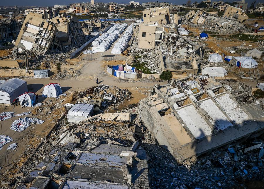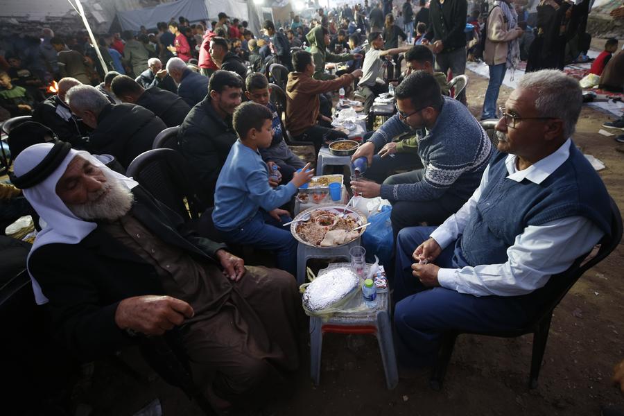 GAZA, March 16 (Xinhua) -- Hundreds of Palestinians came together on Saturday in the ruins of Beit Lahiya, northern Gaza, to share Iftar -- when Muslims break the fast during the holy month of Ramadan.