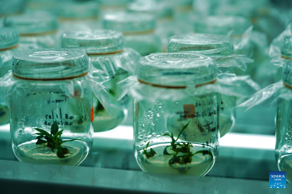 This photo taken on Feb. 17, 2025 shows pineapple seedling culture bottles at a project lab in Horana, Sri Lanka. (Xinhua/Wu Yue)