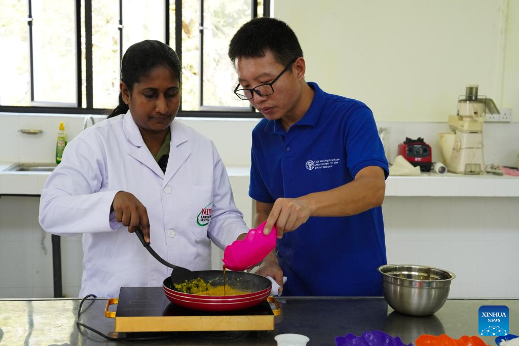 Liu Yangyang (R), an expert from the Chinese Academy of Tropical Agricultural Sciences, instructs his Sri Lankan colleague to make pineapple cake in Anuradhapura, Sri Lanka, on Feb. 21, 2025. (Xinhua/Wu Yue)