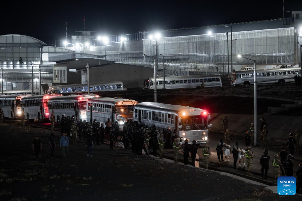 Deportees from the U.S. arrive at the Terrorism Confinement Center in Tecoluca, El Salvador, March 16, 2025. The U.S. administration deported nearly 300 people who it says are members of the Tren de Aragua (TdA) gang to El Salvador over the weekend, according to a White House statement released Sunday. (El Salvador's Presidency/Handout via Xinhua)