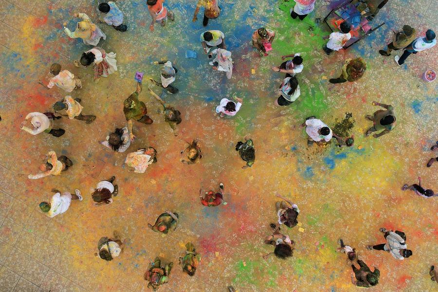 An aerial drone photo taken on March 16, 2025 shows people throwing colored powder during the Holi Festival at Gambir Expo in Jakarta, Indonesia. (Xinhua/Veri Sanovri)