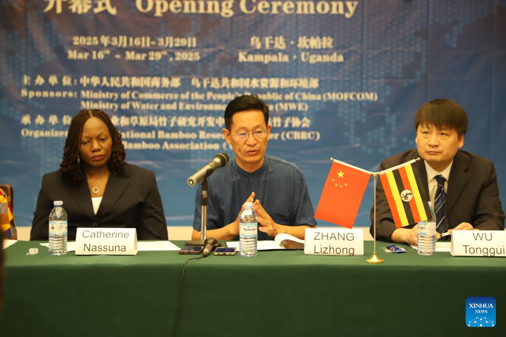 Wu Tonggui (L), vice director-general of the China National Bamboo Research Center (CNBRC), speaks at the opening ceremony of the Training Course in Uganda on Charcoal Processing through Utilization of Wood and Bamboo in Kampala, Uganda, on March 16, 2025. A team of visiting Chinese experts on Sunday began a 14-day training session with Ugandan farmers and industry players on the production and utilization of bamboo charcoal. (Photo by Ronald Ssekandi/Xinhua)