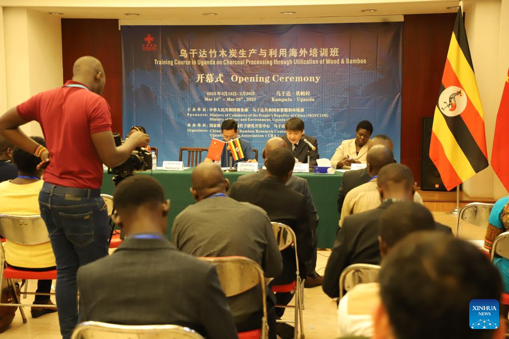 The opening ceremony of the Training Course in Uganda on Charcoal Processing through Utilization of Wood and Bamboo is held in Kampala, Uganda, on March 16, 2025. A team of visiting Chinese experts on Sunday began a 14-day training session with Ugandan farmers and industry players on the production and utilization of bamboo charcoal. (Photo by Ronald Ssekandi/Xinhua)