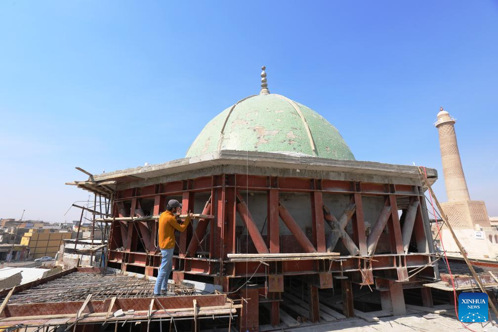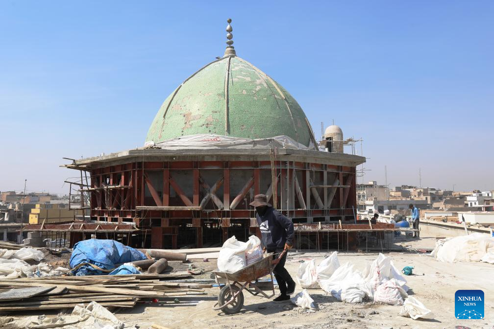 This photo taken on March 17, 2025 shows the reconstruction site of the Grand al-Nuri Mosque in the old city of Mosul, Iraq. The Grand al-Nuri Mosque was built in 1172 with its famous leaning minaret, which gave the city its nickname "al-Hadbaa" or "the hunchback." In 2017, the Islamic State (IS) militants blew up Mosul's al-Nuri Mosque and its al-Hadbaa minaret. (Xinhua/Khalil Dawood)
