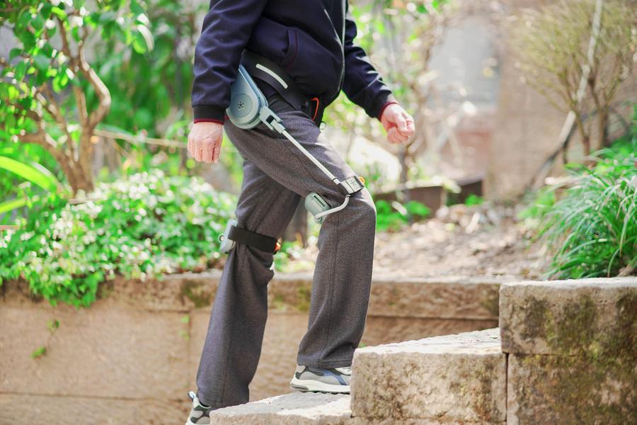 An exoskeleton walking aid device, designed by startup RoboCT located in Hangzhou in east China's Zhejiang Province, can make hiking easier for seniors by counteracting the weight of five bottles of water with each leg lift.