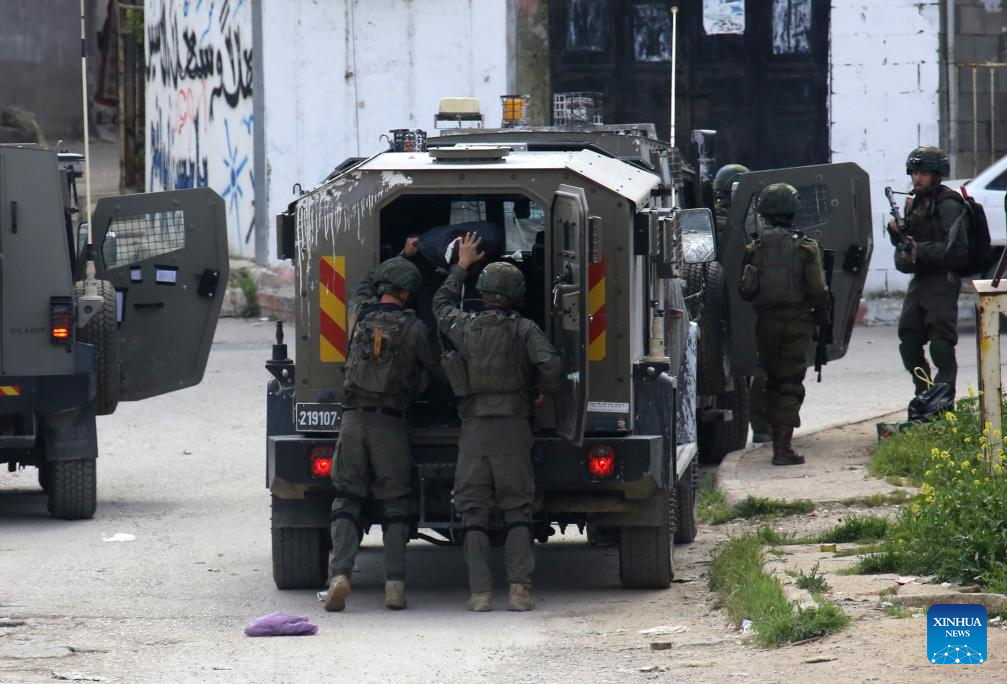 Israeli soldiers detain a Palestinian during a military operation in the Askar al-Jadid camp, east of Nablus in the West Bank, on March 18, 2025. (Photo by Nidal Eshtayeh/Xinhua)
