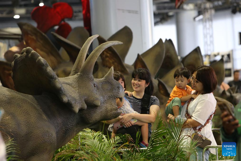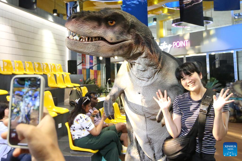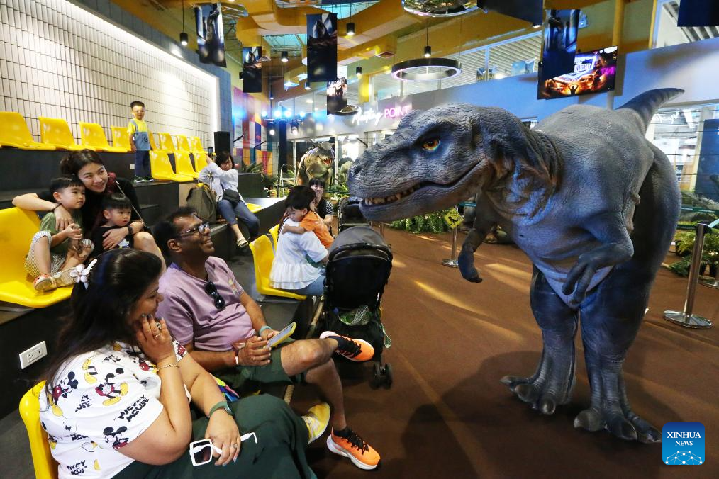 People visit a dinosaur exhibition in MBK center shopping mall in Bangkok, Thailand on March 18, 2025. The shopping mall held an exhibition to provide visitors with a glimpse of the age of the dinosaurs. (Xinhua/Rachen Sageamsak)