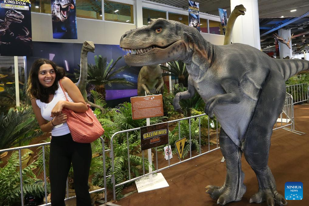 A person reacts at a dinosaur exhibition in MBK center shopping mall in Bangkok, Thailand on March 18, 2025. The shopping mall held an exhibition to provide visitors with a glimpse of the age of the dinosaurs. (Xinhua/Rachen Sageamsak)