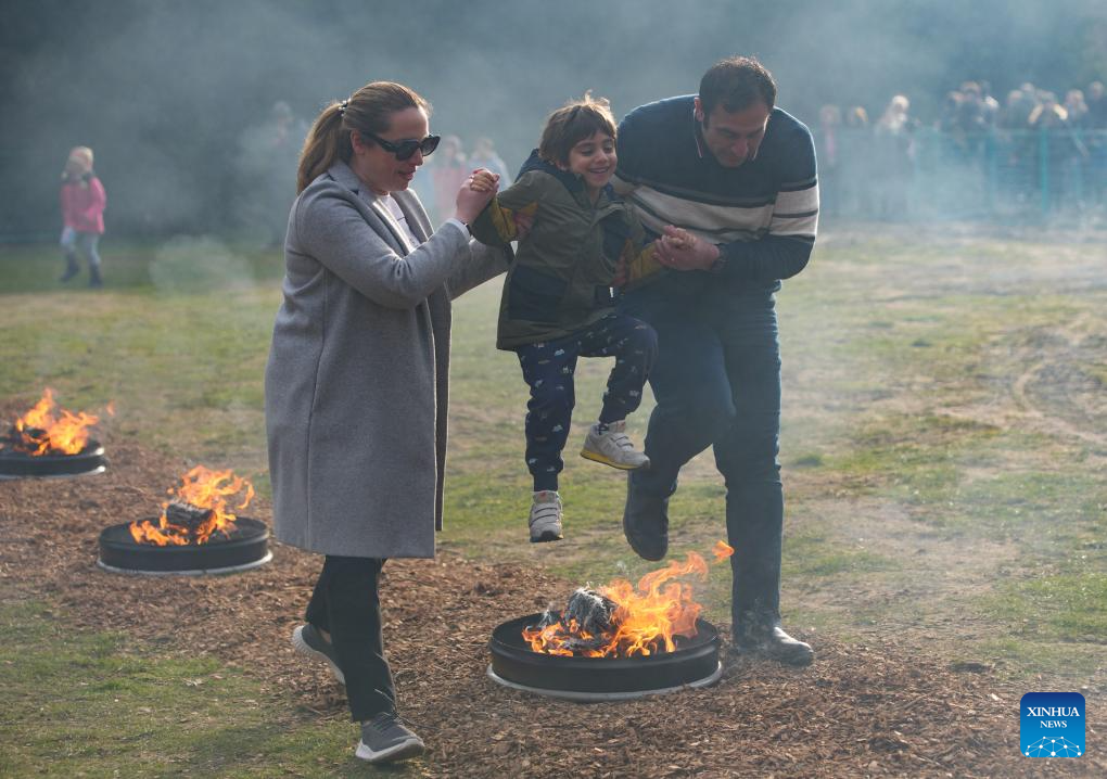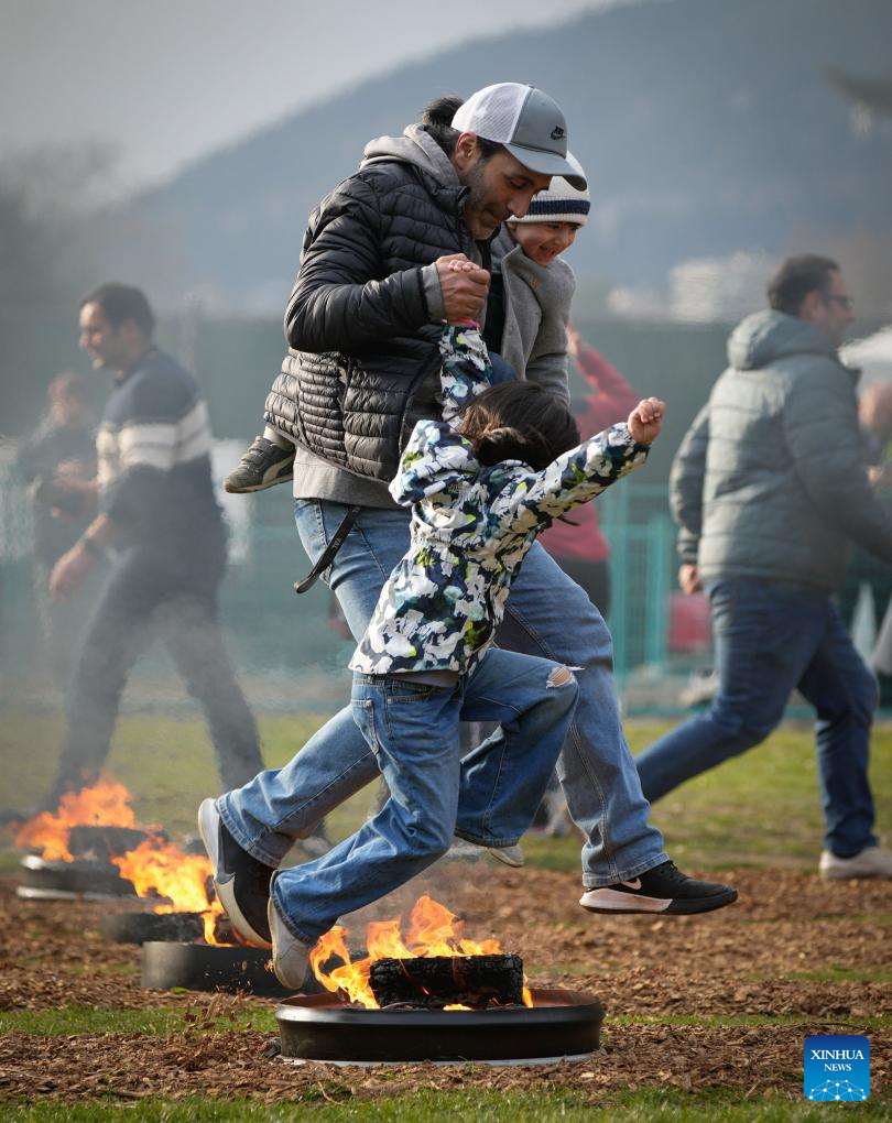 People leap over a bonfire during a fire festival at Ambleside Park in West Vancouver, British Columbia, Canada, March 18, 2025. The local Iranian community participated in the fire festival on Tuesday to celebrate the upcoming Nowruz, the Iranian New Year, which falls on March 20 this year. (Photo by Liang Sen/Xinhua)