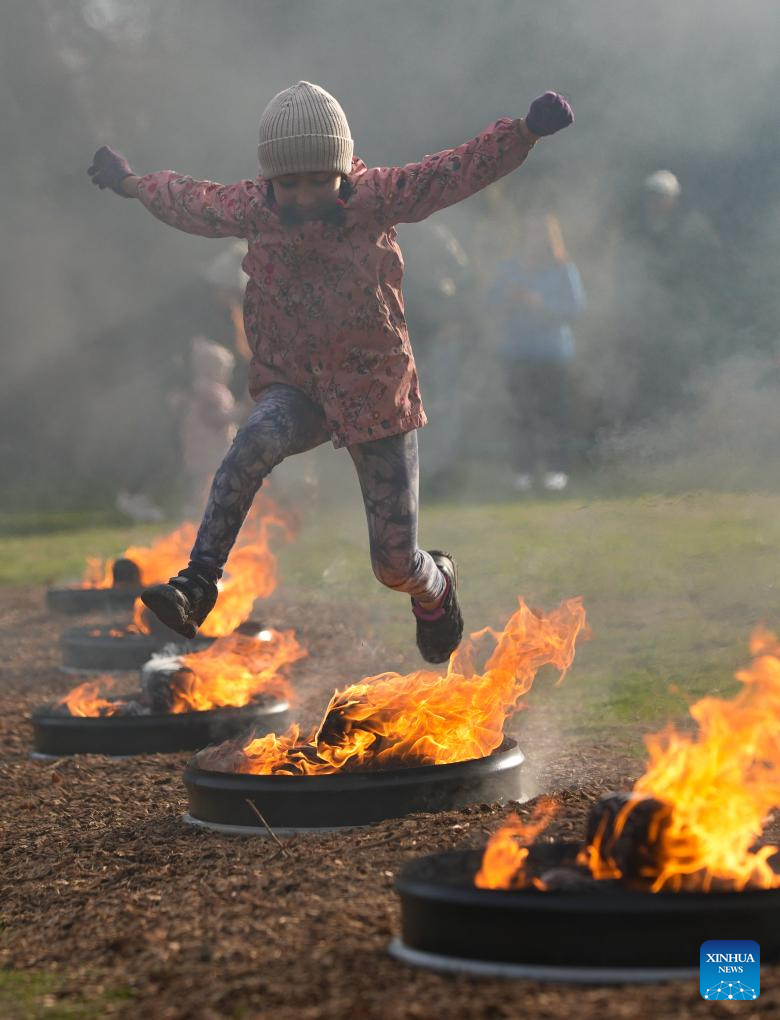 A girl leaps over a bonfire during a fire festival at Ambleside Park in West Vancouver, British Columbia, Canada, March 18, 2025. The local Iranian community participated in the fire festival on Tuesday to celebrate the upcoming Nowruz, the Iranian New Year, which falls on March 20 this year. (Photo by Liang Sen/Xinhua)
