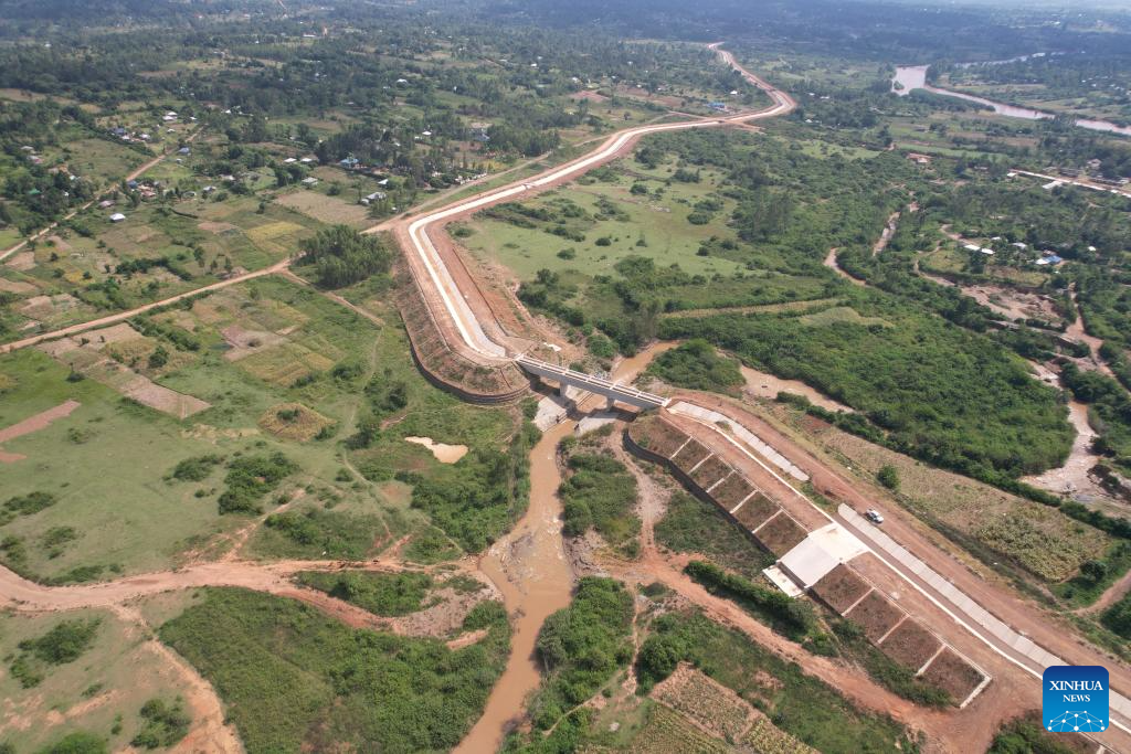 An aerial drone photo taken on Sept. 17, 2020 shows a view of the construction site of a flood control project in Siaya County, western Kenya. Built by China's Sino Hydro Company Limited, the Lower Nzoia Irrigation project is a national project domiciled in the Ministry of Water and Irrigation. Its implementation started in June 2018, with the goal of mitigating floods and increasing the acreage of land under irrigation in western Kenya.