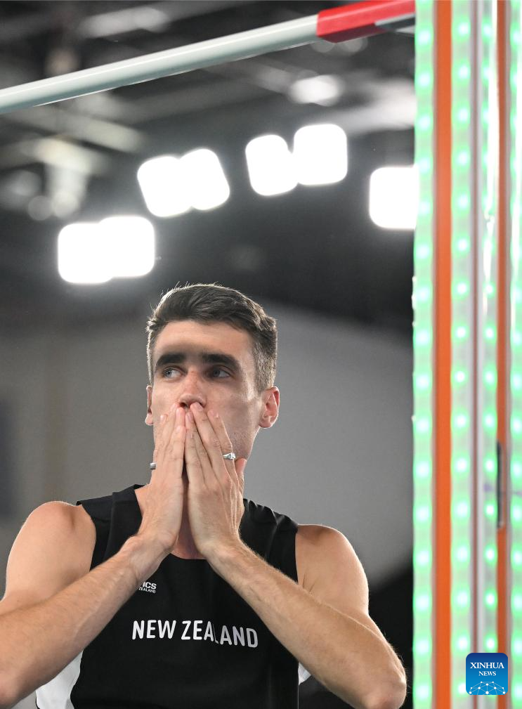 Hamish Kerr of New Zealand reacts during the men's high jump final at the 2025 World Athletics Indoor Championships in Nanjing, east China's Jiangsu Province, March 21, 2025. (Xinhua/Song Yanhua)