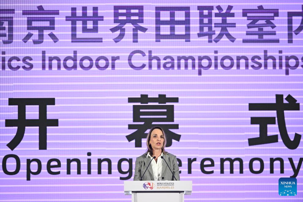 Ximena Restrepo, Vice President of World Athletics, addresses during the opening ceremony of the 2025 World Athletics Indoor Championships in Nanjing, east China's Jiangsu Province, March 21, 2025. (Xinhua/Song Yanhua)