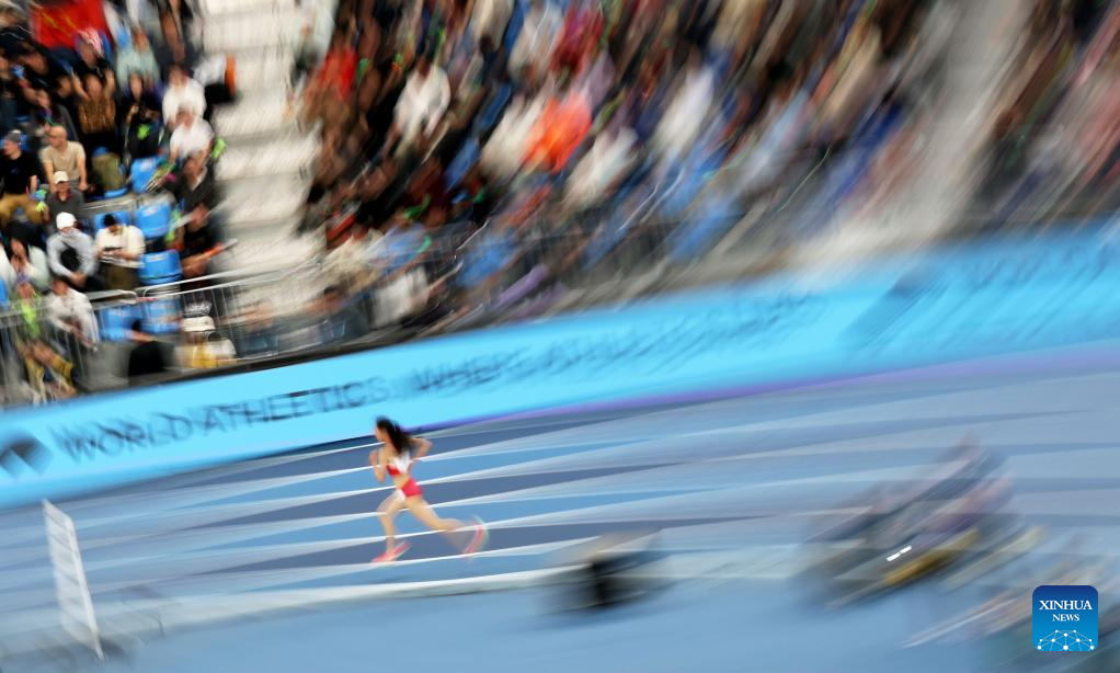 A photo taken with zoom lens effect shows Xu Hui of China competing during the heat of women's 1500m at the 2025 World Athletics Indoor Championships in Nanjing, east China's Jiangsu Province, March 21, 2025. (Xinhua/Li Ming)