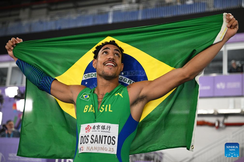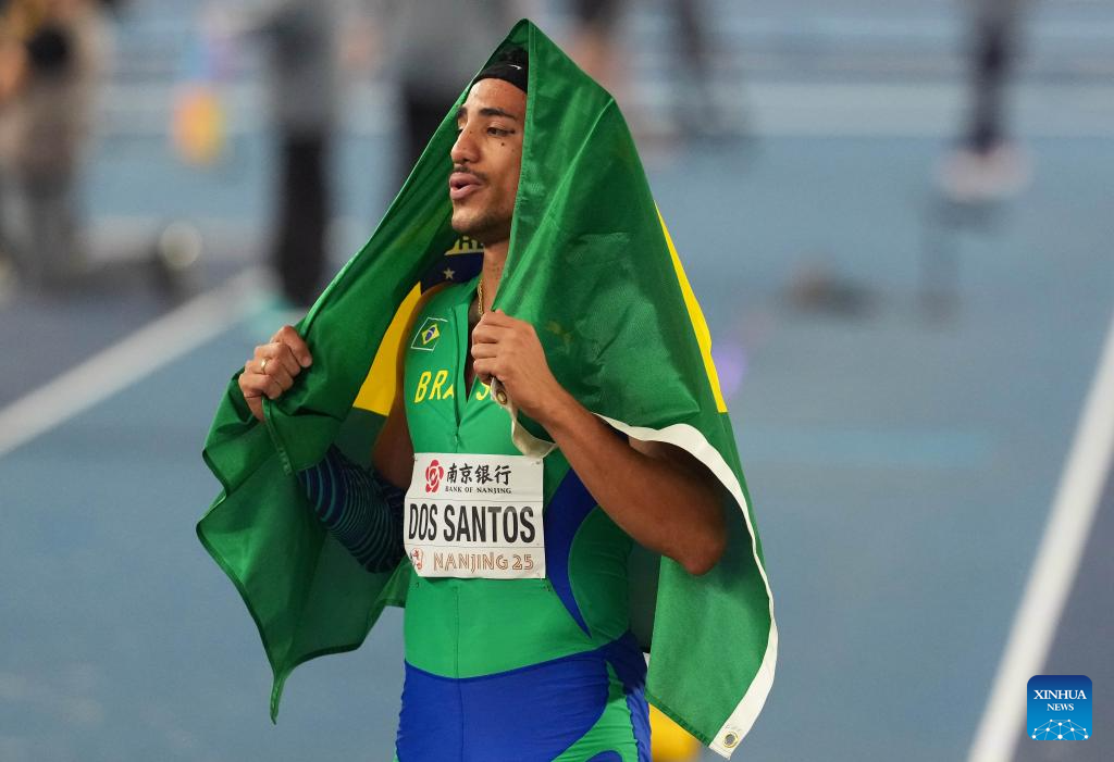 Almir Dos Santos of Brazil celebrates after the men's triple jump final at the 2025 World Athletics Indoor Championships in Nanjing, east China's Jiangsu Province, March 21, 2025. (Xinhua/Song Yanhua)