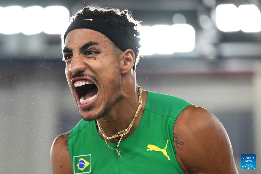 Almir Dos Santos of Brazil reacts during the men's triple jump final at the 2025 World Athletics Indoor Championships in Nanjing, east China's Jiangsu Province, March 21, 2025. (Xinhua/Song Yanhua)