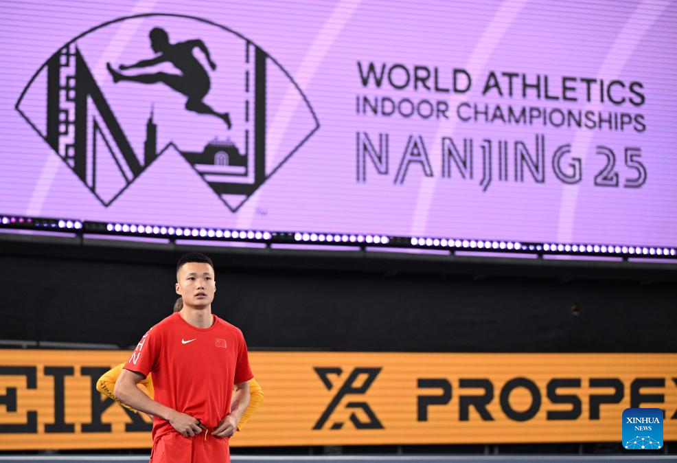Zhu Yaming of China reacts before the men's triple jump final at the 2025 World Athletics Indoor Championships in Nanjing, east China's Jiangsu Province, March 21, 2025. (Xinhua/Song Yanhua)
